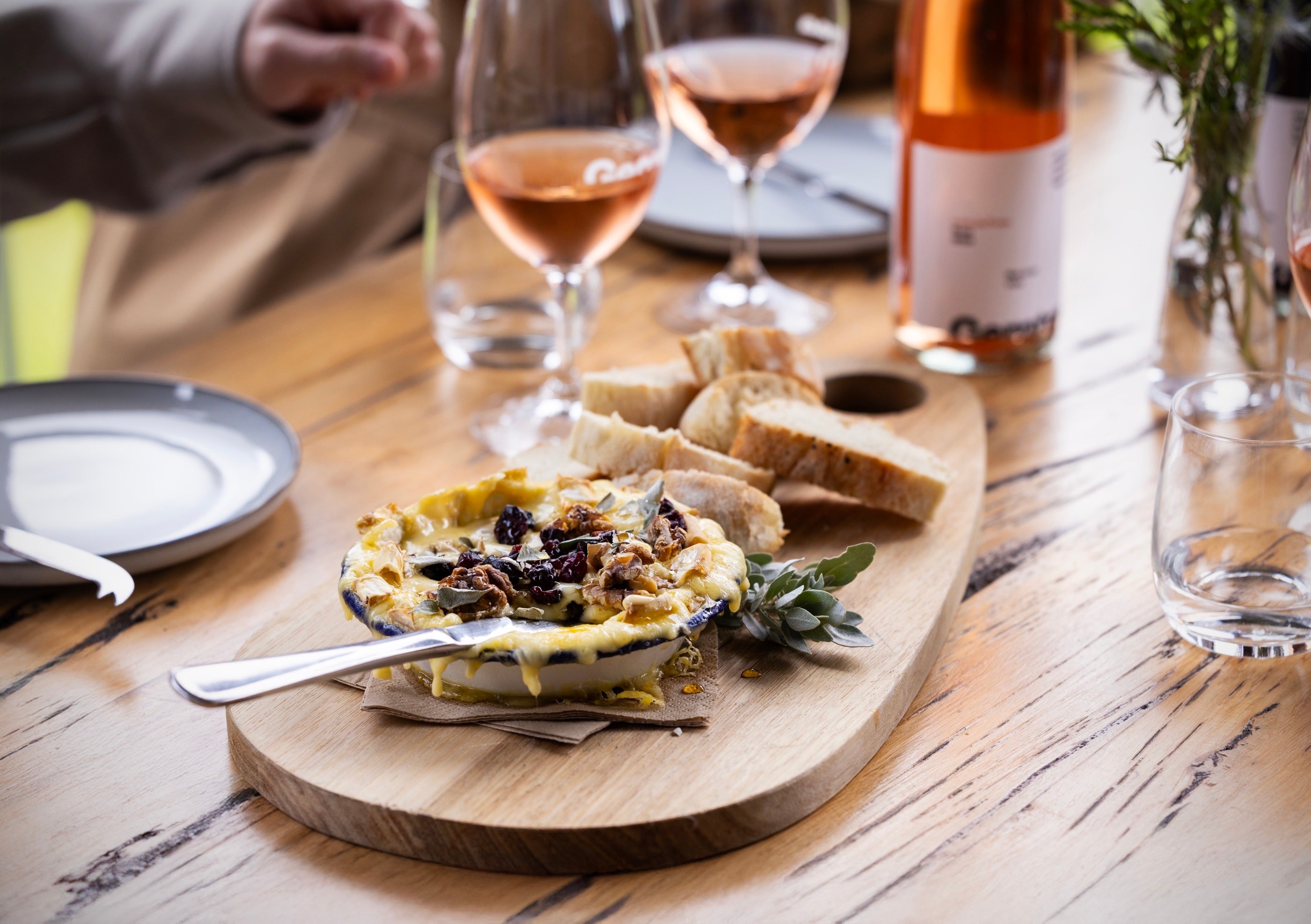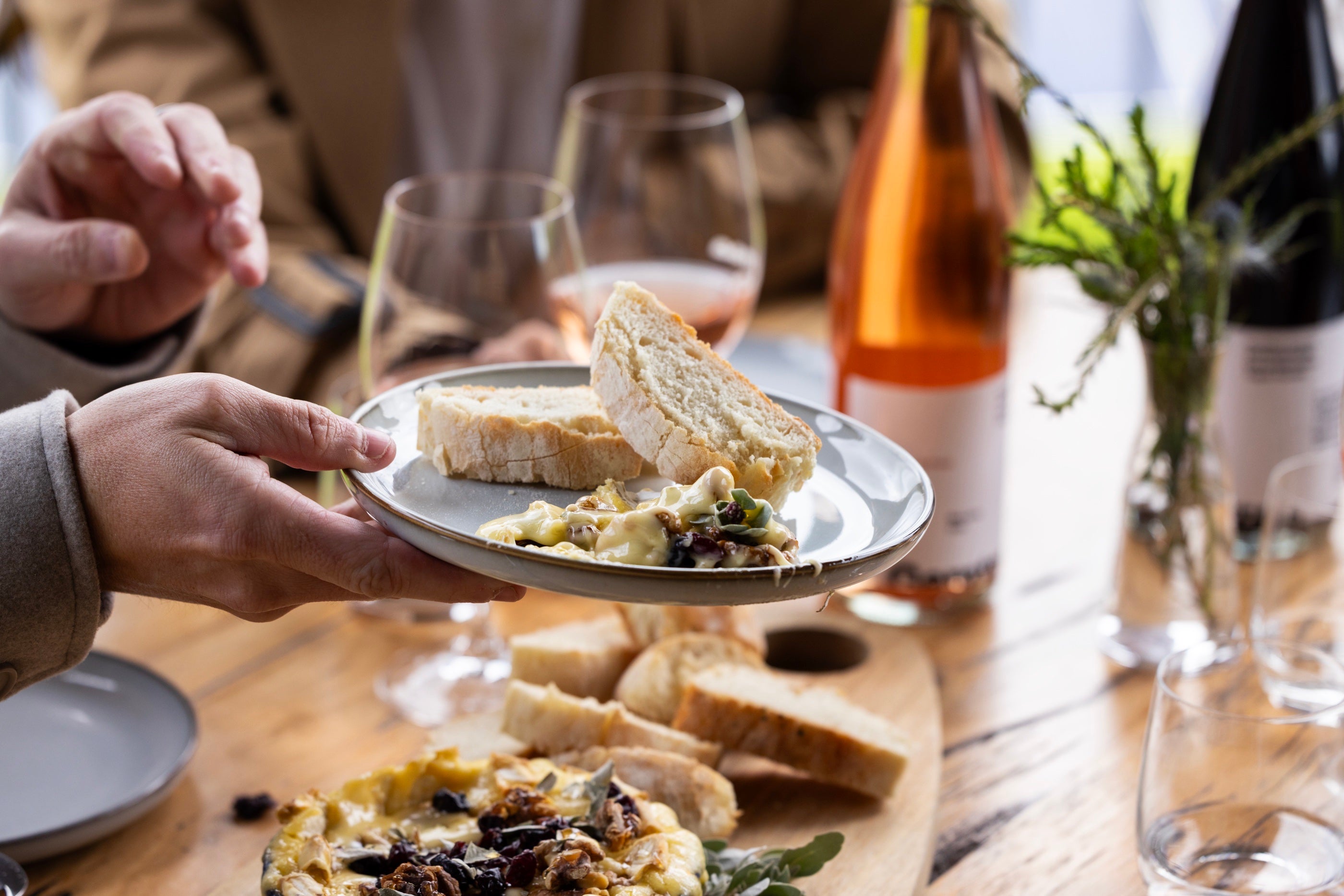 Indulge in a warming whole baked triple cream Camembert for two from Paris Creek Farms (organic/biodynamic) with honey, cranberries, walnuts, and saltbush (from our garden!) alongside crusty bread from local Fleurieu legend, Andy Clappis and a glass of red, white or rose from Gemtree's Foundation Collection.