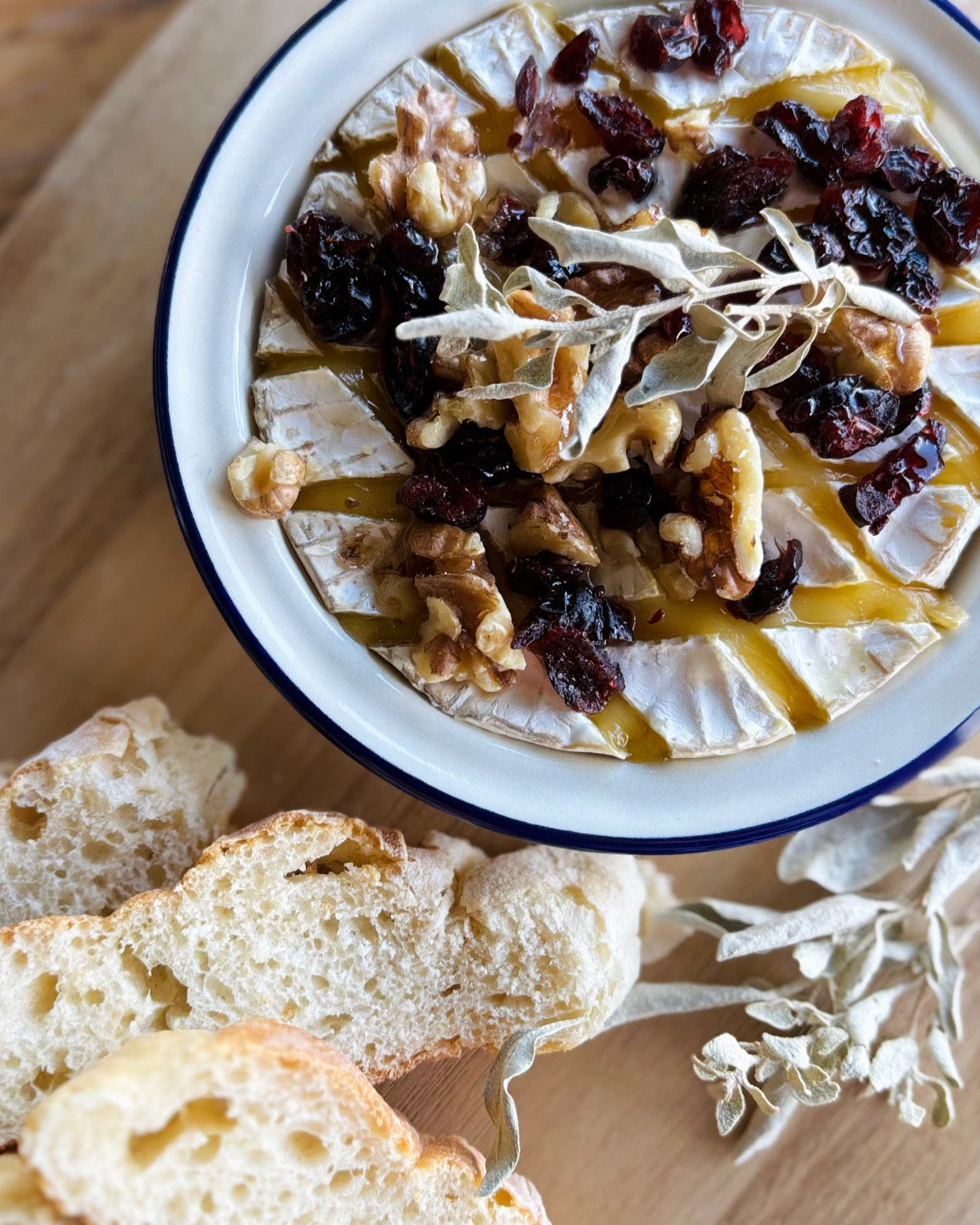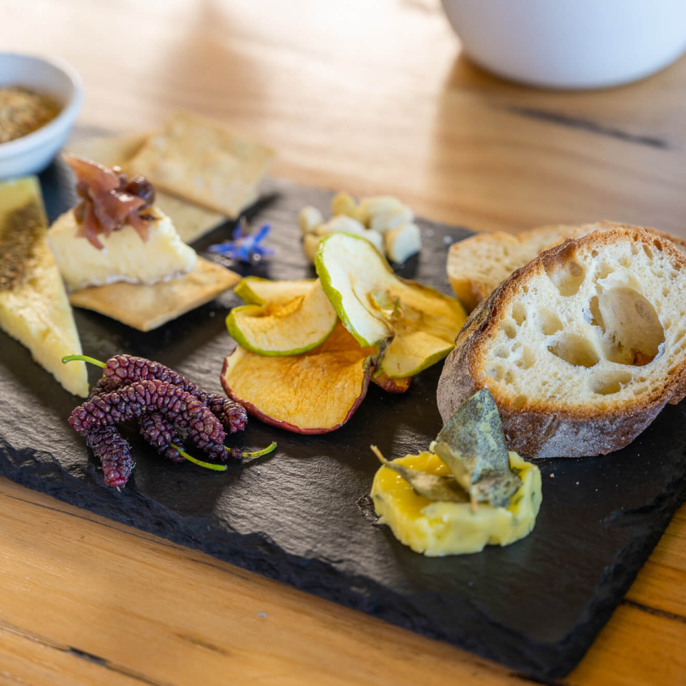 Indulge in a whole baked triple cream Camembert for two from Paris Creek Farms (organic/biodynamic) with honey, cranberries, walnuts, and saltbush (from our garden!) alongside crusty bread and a glass of wine from our Foundation Collection.